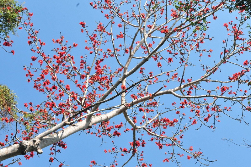 咦,春天來(lái)了。這粗糙且?guī)Я龃痰能|干,干枯的樹枝,雖然挺拔,但總歸突顯蒼老。不曾想,這毫不起眼的枯樹,卻在這春意盎然的雨天,綻放出火焰般的生命,這突如其來(lái)的綻放似那騰空而起的煙花,一樣的耀眼卻不一樣的安靜。駐足凝視,這碗大的花朵,恰似染紅的羽毛球,五片擁有強(qiáng)勁曲線的花瓣,包圍一束綿密的黃色花蕊,收束于緊實(shí)的花托。此花素而不艷、嫩而不嬌、爽而不躁,撩我心弦,卻道不出為何花。心動(dòng)而好奇,好奇而愕然。路人甲“哎,那是木棉花,英雄花”。驚愕,卻也高興,雖不識(shí)廬山,但總歸能為其巍峨、壯麗而吸引。