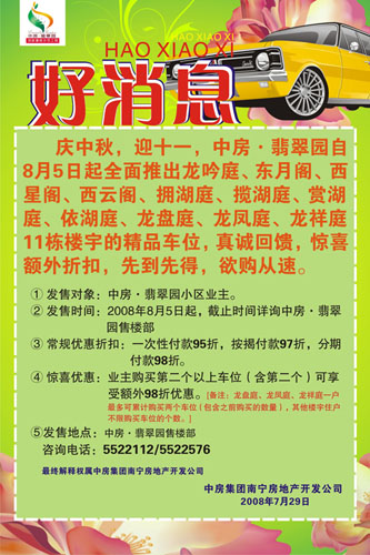 慶中秋,迎十一,中房·翡翠園自85日起全面推出龍吟庭、東月閣、西星閣、西云閣、擁湖庭、攬湖庭、賞湖庭、依湖庭、龍盤(pán)庭、龍鳳庭、龍祥庭11棟樓宇的精品車位,真誠(chéng)回饋,驚喜額外折扣,先到先得,欲購(gòu)從速。